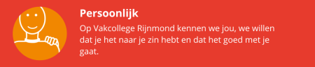 Op Vakcollege Rijnmond krijg jij je eigen mentor die je meerdere uren per week ziet, daardoor kent de mentor jou. De mentor zorgt er ook voor dat de andere docenten weten wat jij nodig hebt om goed te kunnen leren en hoe het met je gaat. Je kunt altijd bij je mentor terecht en je ouders trouwens ook. Op Vakcollege Rijnmond vinden we het namelijk heel belangrijk dat jij het naar je zin hebt en dat het goed met je gaat.