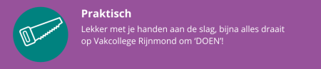 Op Vakcollege Rijnmond draait echt alles om ‘DOEN’. Wij zien dat onze leerlingen, en jij dus waarschijnlijk ook, veel makkelijker leren door het te doen. Minder boeken, meer praktijk. Je zit bij ons dus eigenlijk nooit een hele dag, je bent bezig in onze mooie praktijklokalen. Zo hebben we technieklokalen met professionele machines en gereedschap. Bij de afdeling zorg hebben we een eigen beautysalon en wat denk je van een winkel bij Economie?